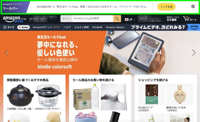 Amazonアソシエイトのアカウントにログインした状態で、Amazonを開くと、画面の一番上に「アソシエイト・ツールバー(SiteStripe)」が表示されます。