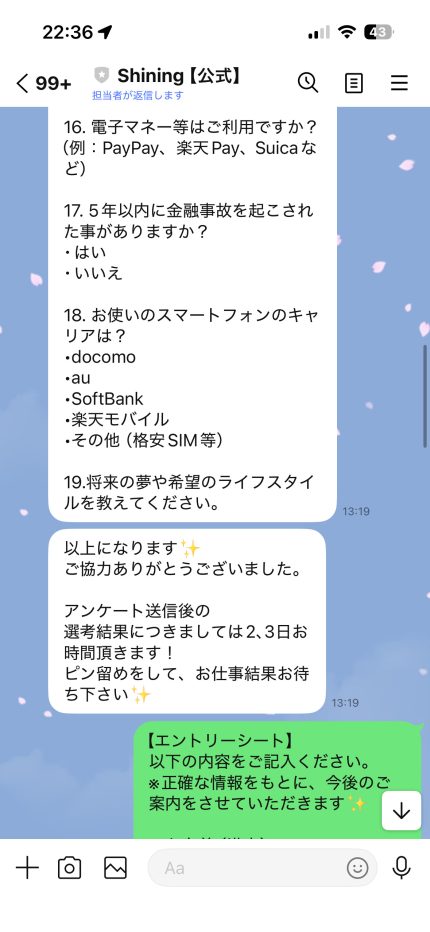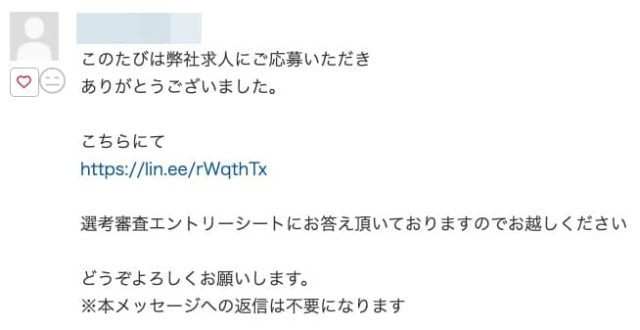 案件に対して応募文を送ったら、「今後のやり取りはLINEで行います」「こちら(LINE)でエントリーシートにお答えください。」などと返信してきます。